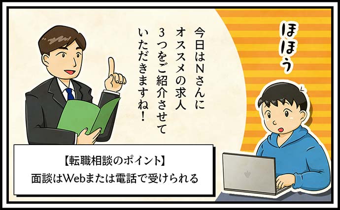 ネット検索でたまたま見つけた「早期離職緊急度診断チガウミカタ」を受けてみた。緊急度はLevel.4だった。「こんな簡単な質問だけで何がわかるのか?」という疑問を感じたが、20代の転職に特化しているエージェントで未経験でも応募できる求人が多数あるということなので、「早期離職者でも応募できる求人はあるのか?」「あるとすればどんな求人があるのか?」そんなことを確認するだけでもいいやと考え、転職相談に申し込んだ。アドバイザーとの面談はWebで受けることが出来た。事前に送られてきたアンケートで詳細については回答していたので、自分の経歴や希望などは面談前に把握されていたので面談は予想以上にスムーズに進んだ。「日本の就活は、ある意味すごく歪(いびつ)で閉鎖的なので、第二新卒を募集する企業は1度目の早期離職には寛大ですから心配はいりませんよ」という言葉がすごく心強く感じたとNさんはいう。求人紹介に関しては、応募可能な求人をドサッと渡されるのかと想像していたがそうではなくたった3社だけ紹介された。3社しかないのかと不安に思ったがそうではなく、これまでも経歴や退職を決意した理由、そして今後の希望などを考慮した上でマッチする確率が高いと思われる求人を3社厳選して、1社1社丁寧に説明を受けた。